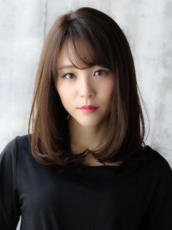ちょっぴり重めの毛先はしっかり内巻き、前髪はさりげないシースルーバングで軽さをプラス。