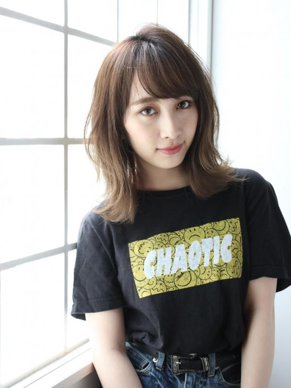 ほつれたようなウェーブと、しっかりめに作ったシースルーバングがポイントのミディアムスタイル。