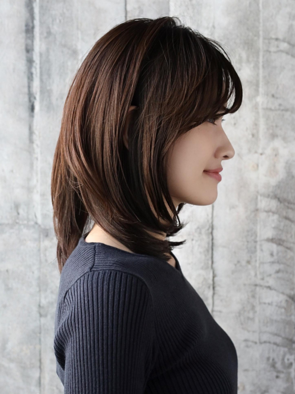 旬のシースルーバングなら、ミディアムヘアにトレンドムードをプラスできます。