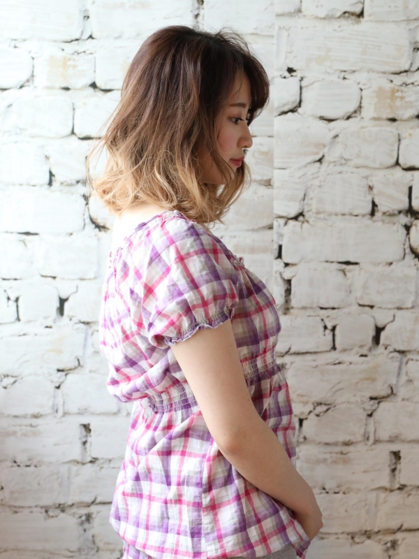 顔周りに入れたレイヤーと斜めバングで、抜け感をプラスしました。