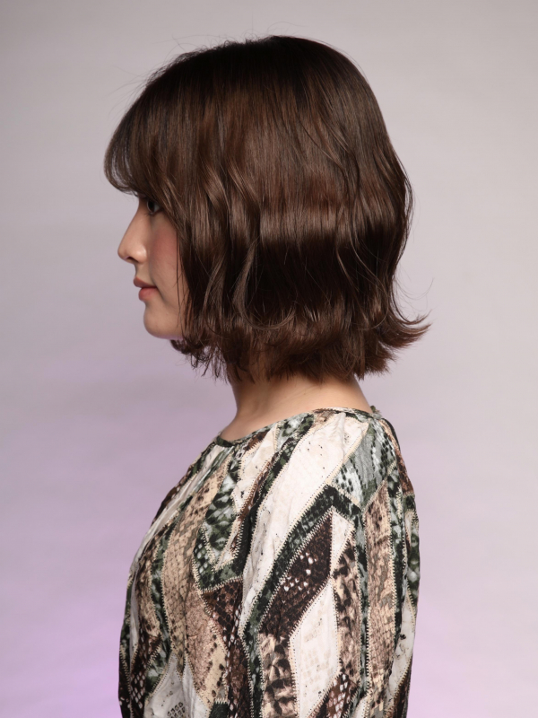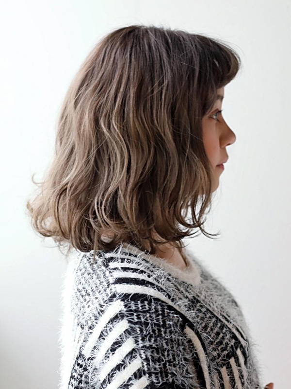 ミディアムボブに波ウェーブを加え、毛先は外ハネにしました。