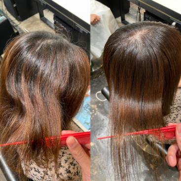 a.はっきりいって伸びます!「優しい」という表現をするとしっかりは伸びないんじゃないかと思われがちですが画像のように綺麗にナチュラルに伸びます!弱酸性の伸びの特徴としては誰もが「この人縮毛矯正かけたな」とわかるパツッとした質感ではなく、地毛っぽいナチュラルな伸び方をしてくれるのが特徴です。