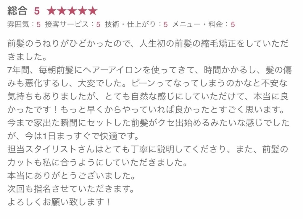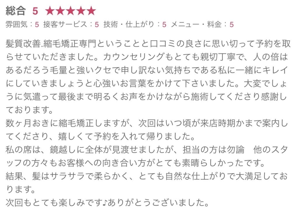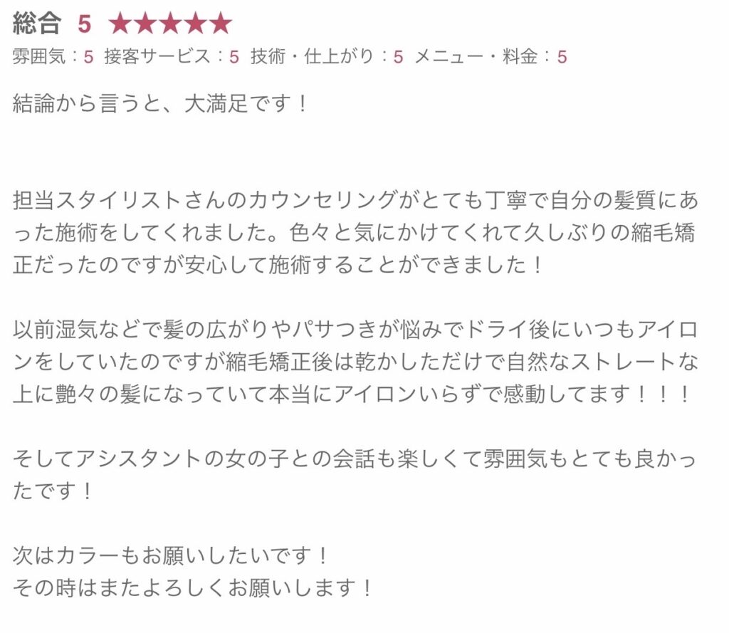 こちらも嬉しい口コミをありがとうございます!1番大事なのは自分が関わってない日にどんだけ綺麗で居れるか、を意識してお話させて頂いてるので今後の縮毛矯正のスケジュールも一緒にお話しさせて頂いてます!