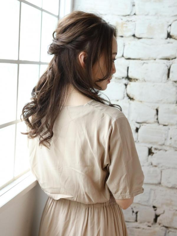 前髪のセンター分けで上品な印象のハーフアップスタイル。