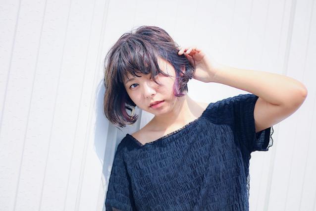 耳元のバイオレットインナーカラーが素敵なボブ。