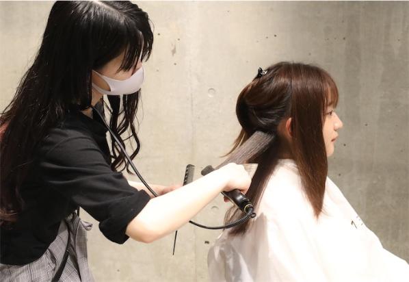 補修が終わったら、しっかりとドライヤーで乾かし、お客様の髪質・状態に合わせてアイロンの温度を調整。5ミリ幅で丁寧にアイロンを入れて髪がしっとりと綺麗におさまるようにしていきます。