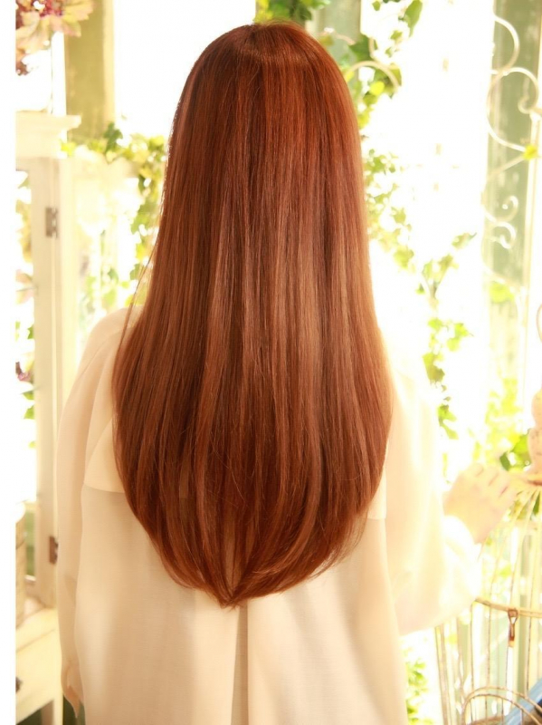 年齢問わず挑戦しやすい、後ろ姿がV字ラインのストレートロングヘア。