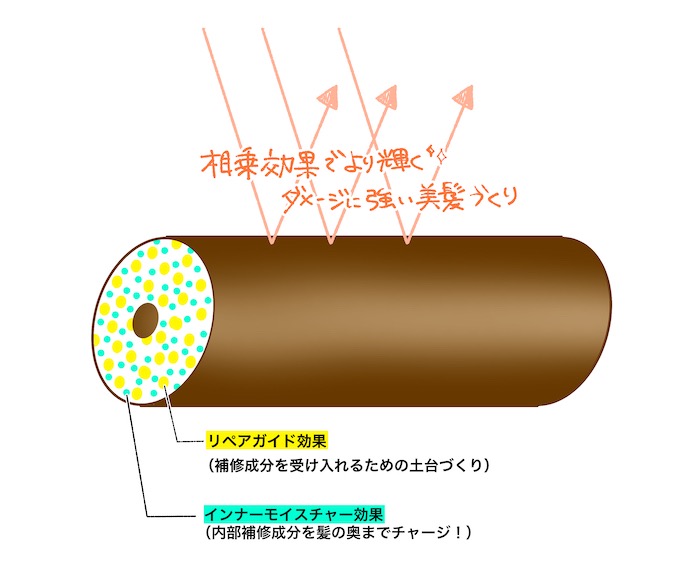 ダメージしてしまった髪はそのまま補修成分を入れてもすぐに髪の外へ流れ出てしまいます。そこでまずは、オイルタイプで髪の中を整え、補修成分を受け入れられる髪作りをする事で、手触りや効果を長持ちさせます。