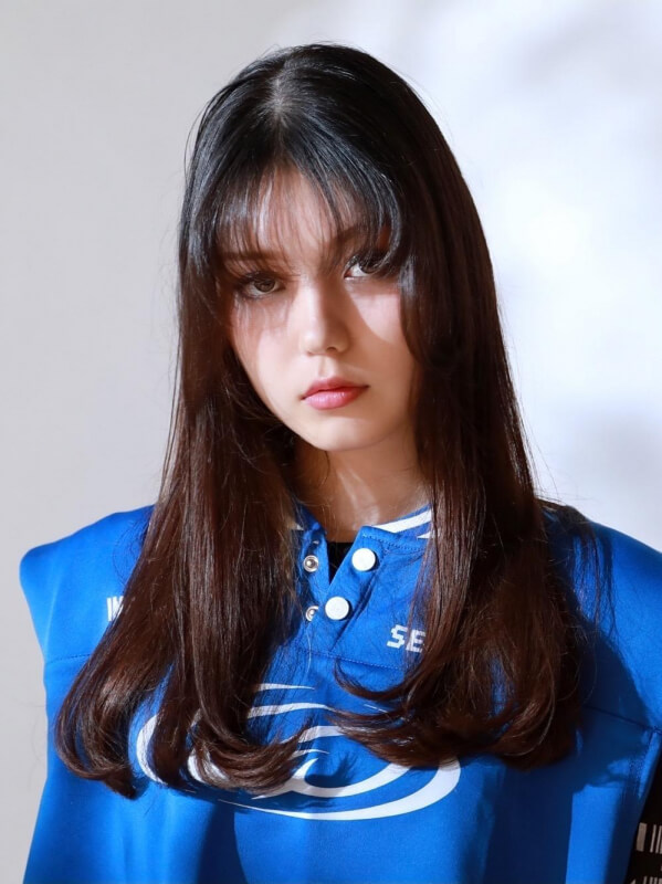 センターパートの前髪をしっかり立ち上げ、重めの毛先と黒髪が韓国っぽさ満点。