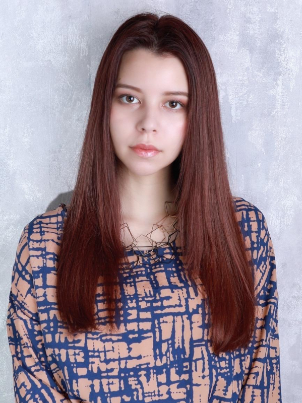 落ち着いたカラーと毛先までしっとり艶やかなストレートロング。