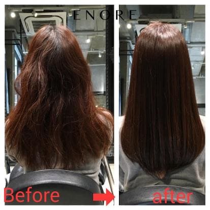 ダメージを最小限に抑えながら縮毛矯正でクセを伸ばす事で、バッチリ髪質改善も行えてデザイン性も考慮した施術を行なっています!また、お客様一人一人髪の毛のお悩みは違うと思います。そんなお悩みもスタイリストが親身になって、解決していく髪質改善が得意なサロンです。エノアに通い続けると、どんどん髪がまとまりやすくツヤツヤ綺麗になっていきます。