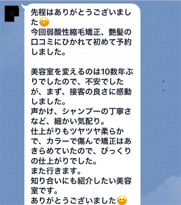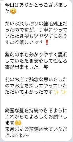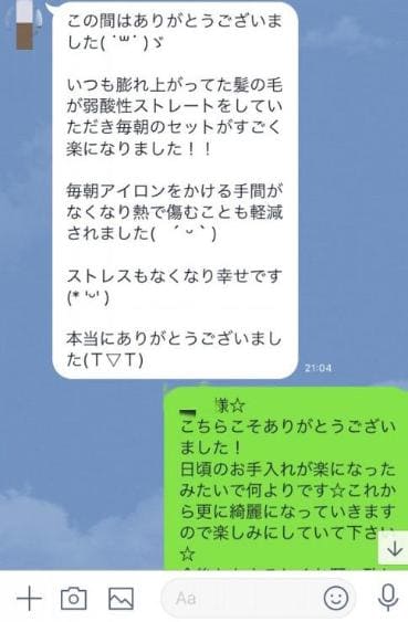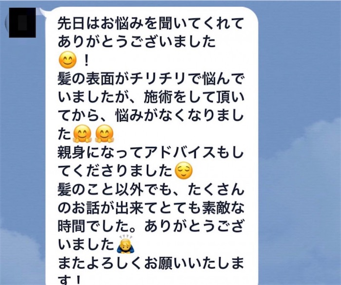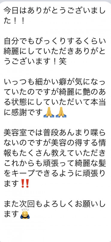 エノアではお客様が髪の毛のお悩みが出来た時相談しやすかったり、ご予約を取りやすい様にスタッフとLINEなどでやり取りをする事がとても多いです(??ω?? )!そこでお客様から頂いた感想を一部ご紹介致します!