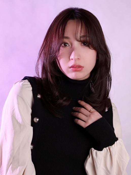 顔まわりレイヤー×斜めバングの効果で小顔に見えるので、面長さんにもおすすめです。