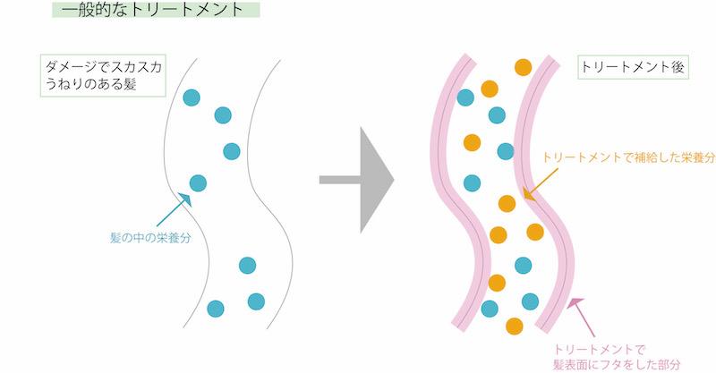 一般的なトリートメントの場合、髪のダメージ部分に「①栄養分を補給」「②栄養分が流れ出ないようにフタをする」